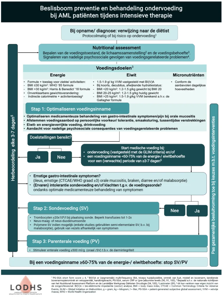 Proactief voedingsbeleid: Verwijs standaard naar de diëtist, omdat intensieve AML-behandelingen gepaard gaan met een hoog risico op ondervoeding door de vele bijwerkingen. Start medische voeding zodra de orale inname <60–75% van de behoefte is voor een verwachte periode van ≥3–7 dagen. Om samen met de patiënt (shared-decision making) en andere zorgprofessionals beslissingen te nemen over het gebruik van medische voeding kan de beslisboom ‘preventie en behandeling ondervoeding bij AML-patiënten tijdens intensieve therapie’ hulp bieden (Figuur 1).